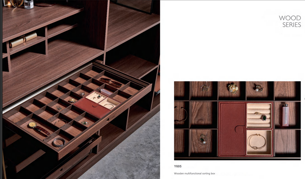 The Y605 Multifunctional Sorting Box features multiple compartments for organizing jewelry and accessories, while the Y610 Wooden Storage Box offers a clean open surface for larger items. Both styles fit any wardrobe cabinet with a depth of 19" or more.